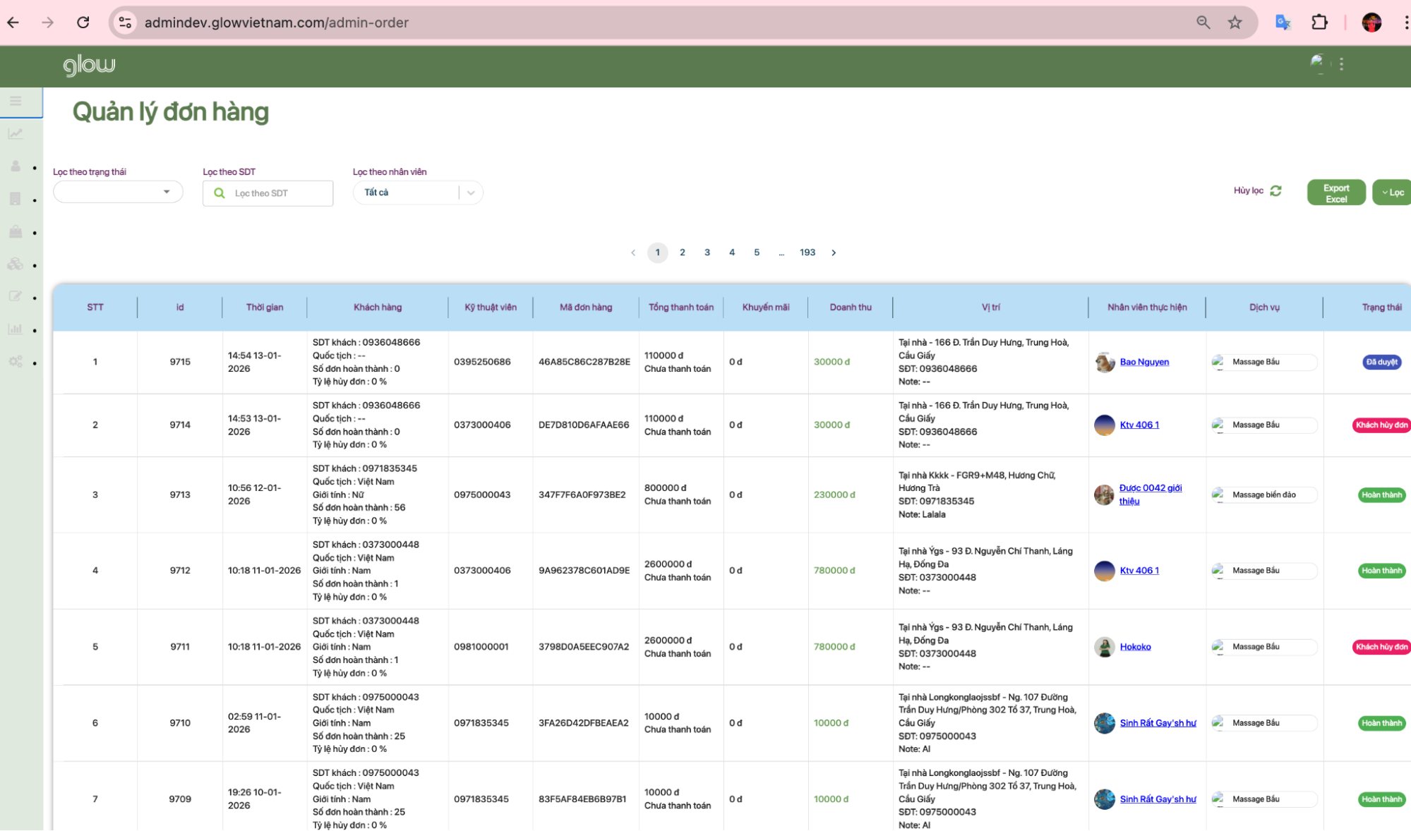 - Kỹ thuật viên thực hiện thanh toán các khoản phí trên mỗi đơn hàng cho Glow theo phương thức sau:
